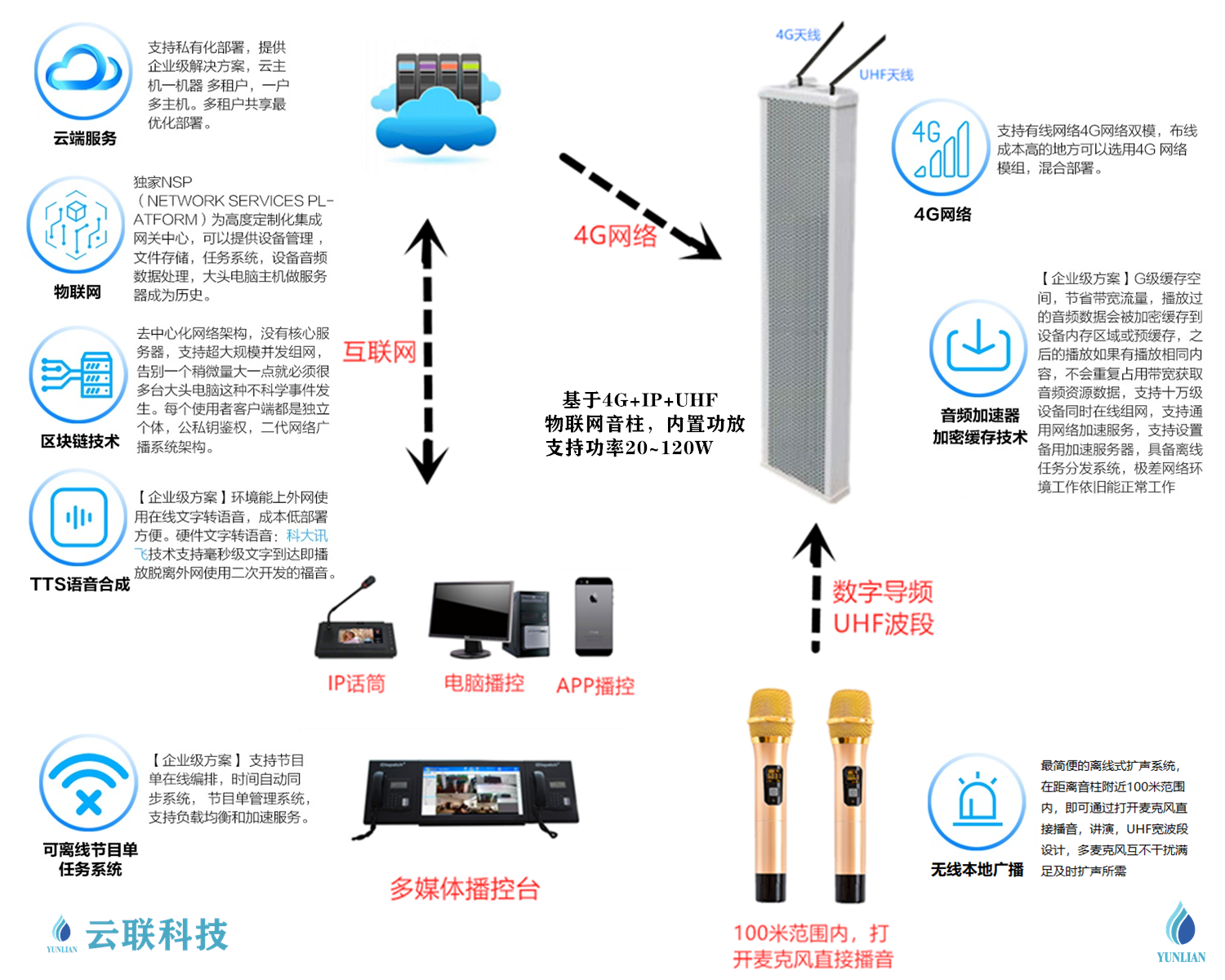 IP網(wǎng)絡(luò)廣播系統(tǒng)的音質(zhì)傳輸采用的全數(shù)字方式,不受傳輸距離的影響,也不受地理環(huán)境的影響,只要有網(wǎng)絡(luò)就能響,而且能夠享受高保真的音質(zhì)效果;純數(shù)字IP廣播系統(tǒng)涵蓋了傳統(tǒng)廣播系統(tǒng)的所有的全部功能,并充分利用了唾手可得網(wǎng)絡(luò)資源,可以隨時(shí)隨地獲取網(wǎng)絡(luò)上的音頻資源,由于每個(gè)終端有獨(dú)立的IP地址因而可以控制任意一個(gè)終端播放不同的節(jié)目。支持全網(wǎng)通4G的IP網(wǎng)絡(luò)音柱,具備自動(dòng)連接網(wǎng)絡(luò)及云
